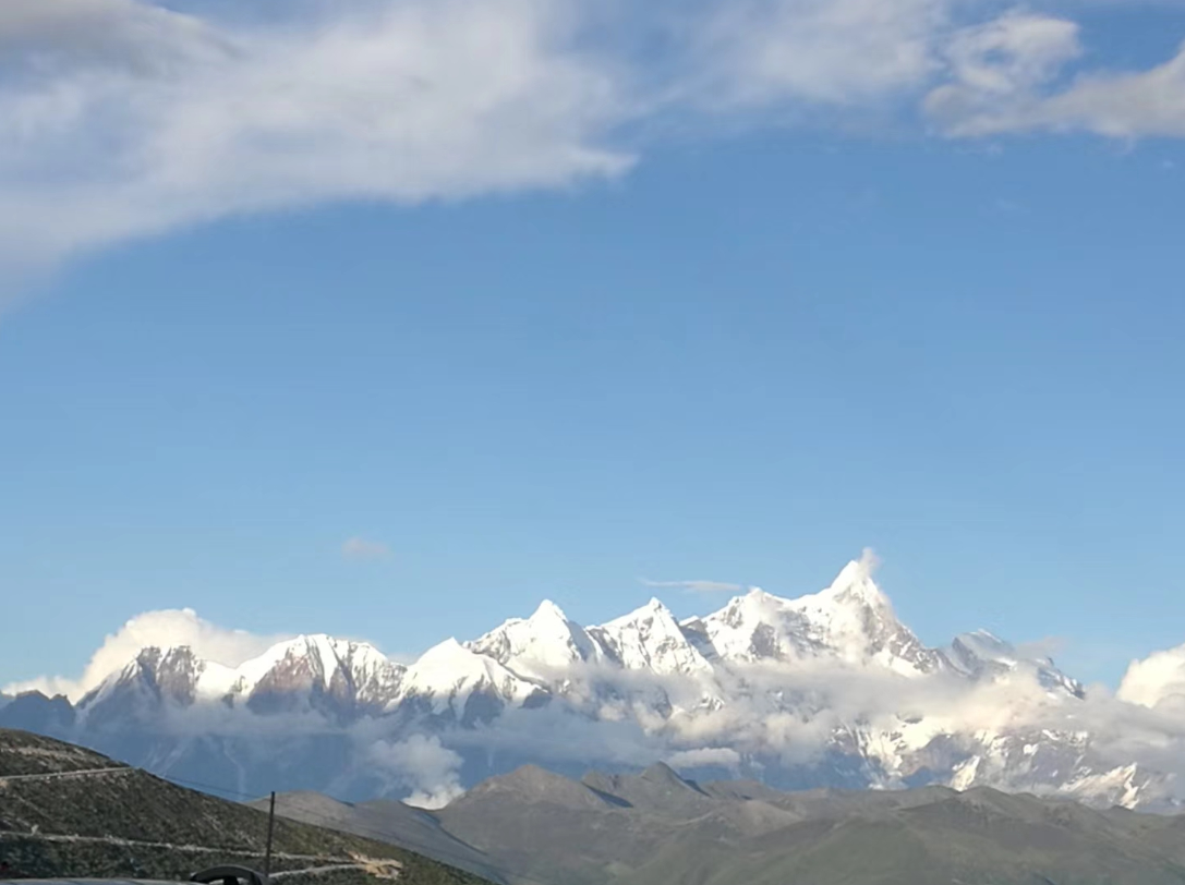 随着道路攀升,身边的雪山不断增加,蓝天白云下的雪山,让西藏的正式游程多了新奇和激动。